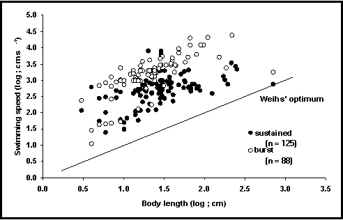 Note also that no fish appears to swim at speeds below Weihs’ (1973) line of