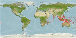 Indo-Pacific: widespread in the tropical Indian Ocean and western Pacific. Known in Australia only from streams in the Kimberley regions of northern western Australia. Africa: widespread but relatively uncommon along east and southeast African coast and Madagascar (Ref. 7248, 52193). Mozambique; Lower Zambezi River (Ref. 39494). Most easily confused with Anguilla obscura and the surest way to distinguish them is by the count of vertebrae (Ref. 9828).