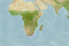 Western Indian Ocean and Southeast Atlantic: Natal to Knysna in South Africa. Once recorded from Moro River in Natal, South Africa (Ref. 4343).